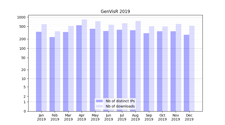 Number of downloads for software package GenVisR, year by year, from 2025 back to 2014 (years with no downloads are omitted):