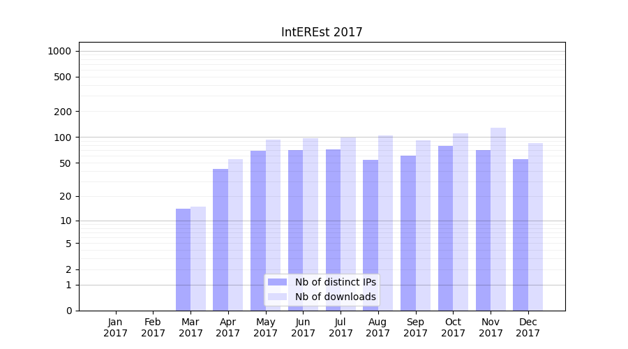 Number of downloads for software package IntEREst, year by year, from 2025 back to 2014 (years with no downloads are omitted):