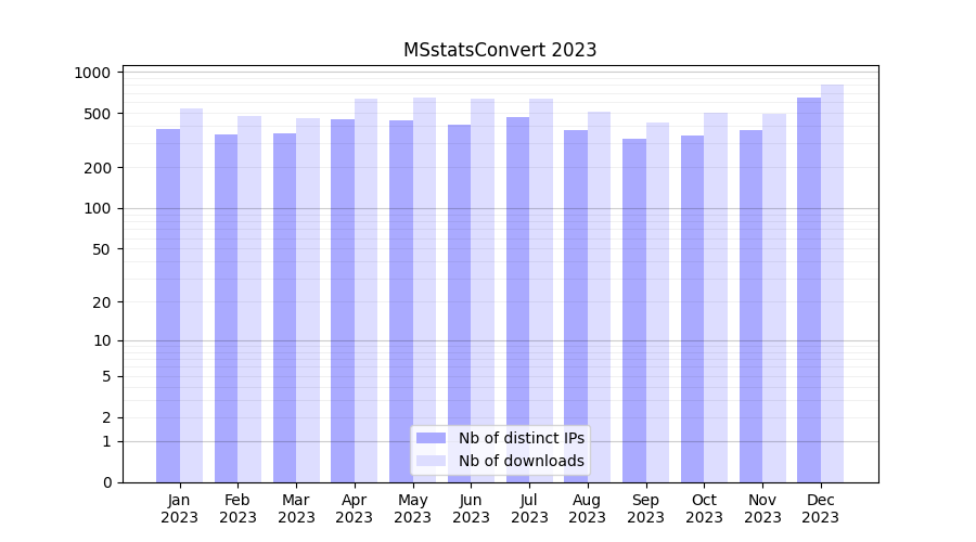Number of downloads for software package MSstatsConvert, year by year, from 2025 back to 2014 (years with no downloads are omitted):