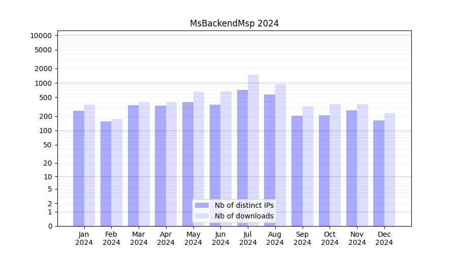 Number of downloads for software package MsBackendMsp, year by year, from 2025 back to 2014 (years with no downloads are omitted):