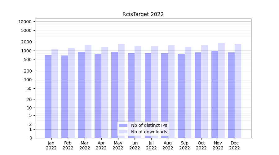 Number of downloads for software package RcisTarget, year by year, from 2025 back to 2014 (years with no downloads are omitted):