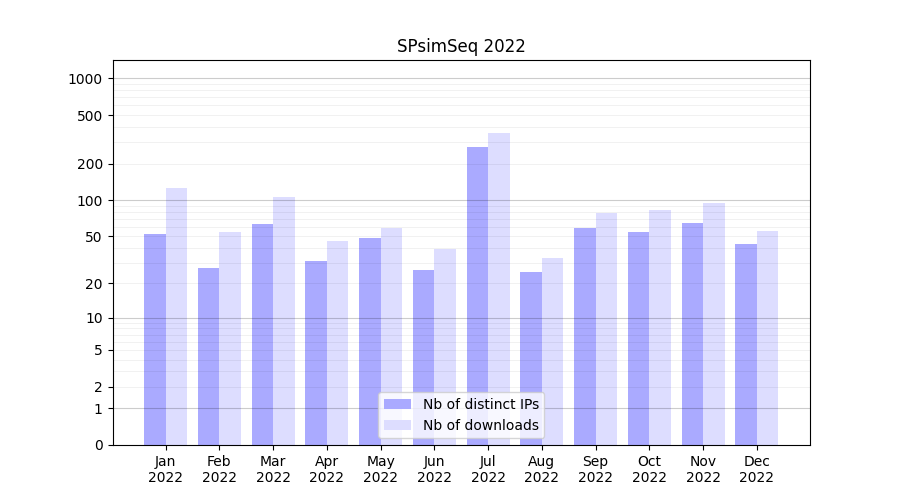 Number of downloads for software package SPsimSeq, year by year, from 2025 back to 2014 (years with no downloads are omitted):