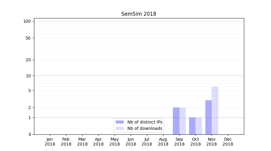 Number of downloads for software package SemSim, year by year, from 2025 back to 2014 (years with no downloads are omitted):