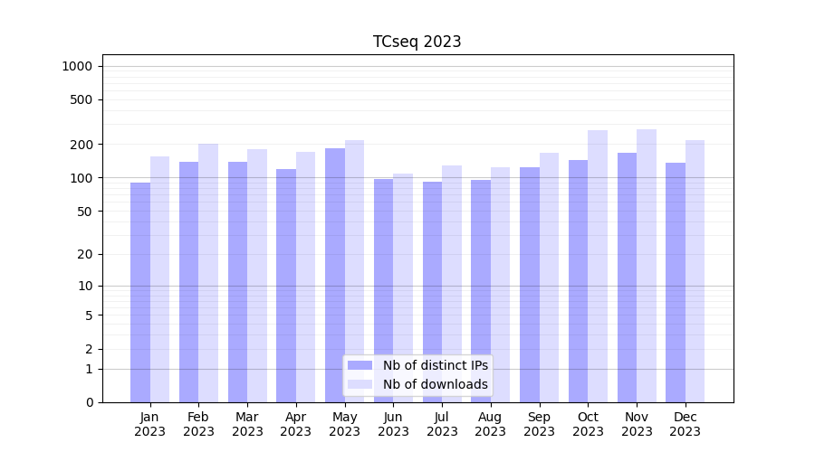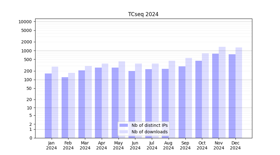 Number of downloads for software package TCseq, year by year, from 2025 back to 2014 (years with no downloads are omitted):