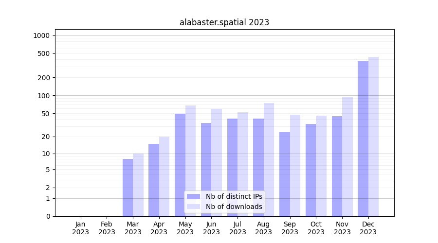 Number of downloads for software package alabaster.spatial, year by year, from 2025 back to 2014 (years with no downloads are omitted):