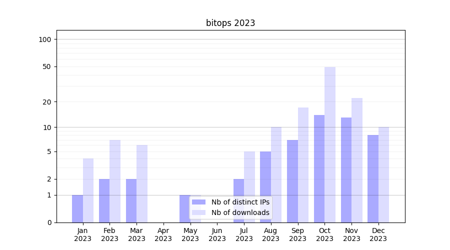 Number of downloads for software package bitops, year by year, from 2025 back to 2014 (years with no downloads are omitted):
