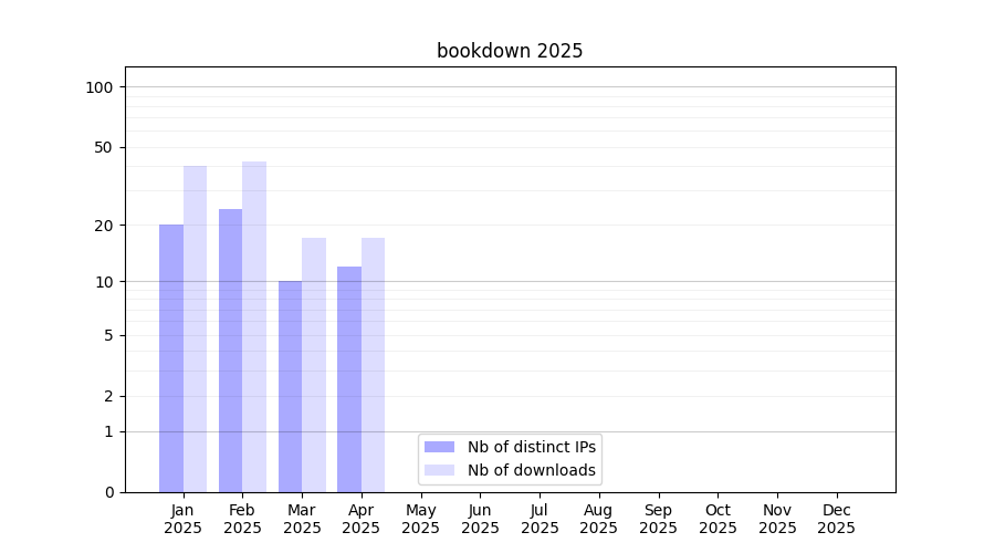 Number of downloads for software package bookdown, year by year, from 2025 back to 2014 (years with no downloads are omitted):