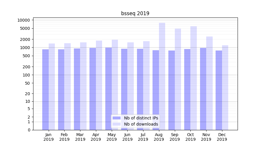 Number of downloads for software package bsseq, year by year, from 2025 back to 2014 (years with no downloads are omitted):