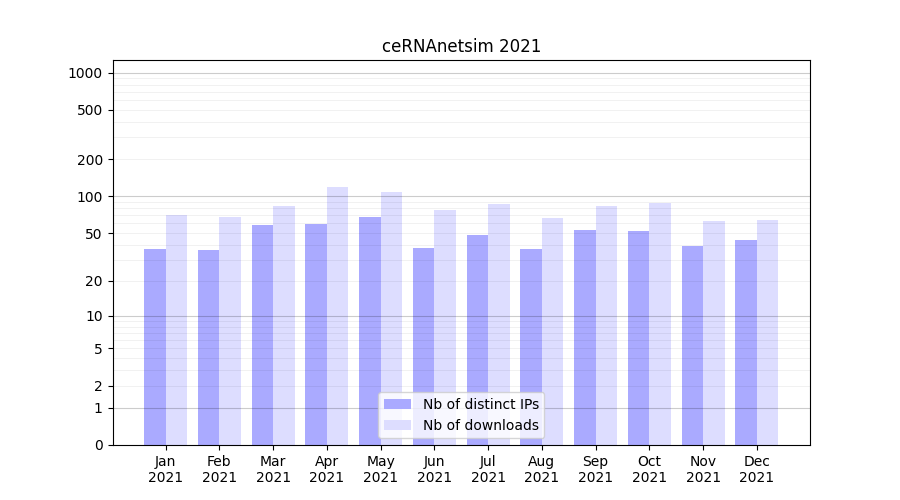 Number of downloads for software package ceRNAnetsim, year by year, from 2025 back to 2014 (years with no downloads are omitted):