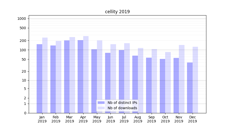 Number of downloads for software package cellity, year by year, from 2025 back to 2014 (years with no downloads are omitted):