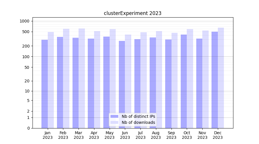 Number of downloads for software package clusterExperiment, year by year, from 2025 back to 2014 (years with no downloads are omitted):
