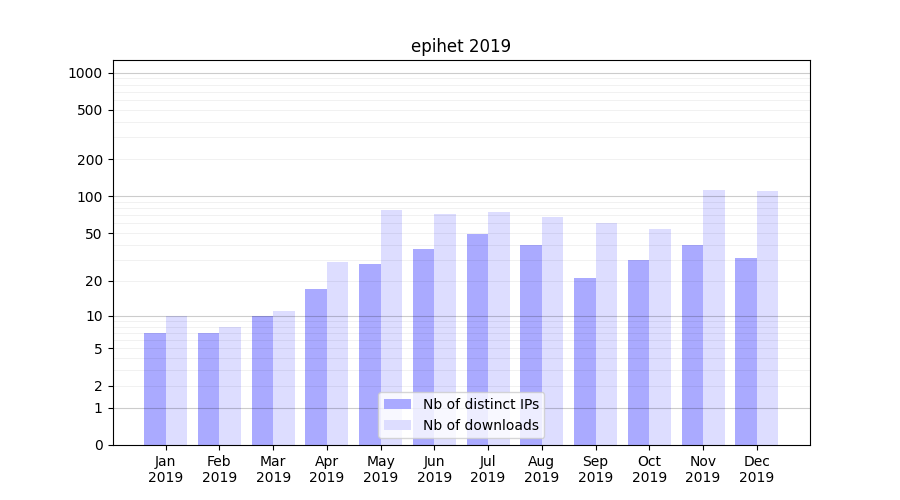 Number of downloads for software package epihet, year by year, from 2025 back to 2014 (years with no downloads are omitted):