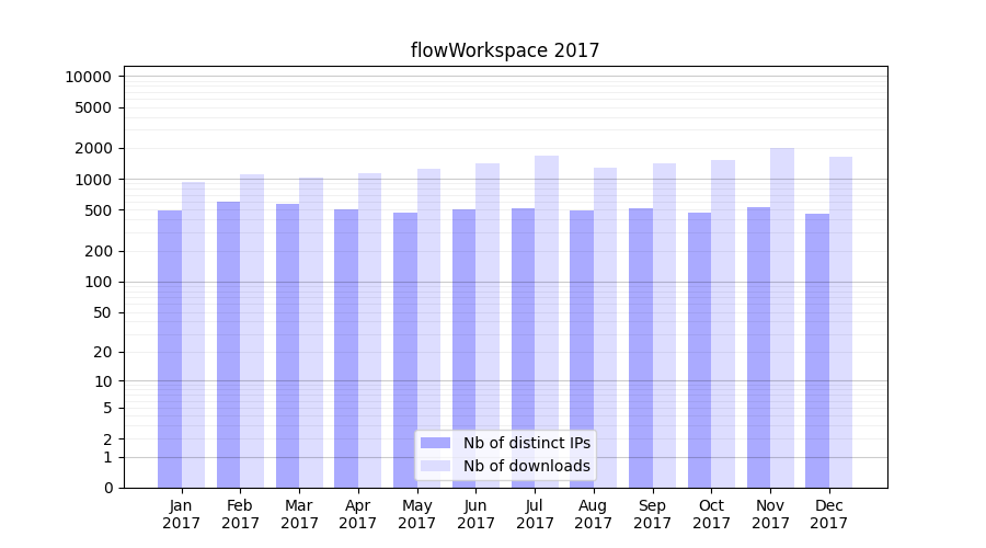 Number of downloads for software package flowWorkspace, year by year, from 2025 back to 2014 (years with no downloads are omitted):