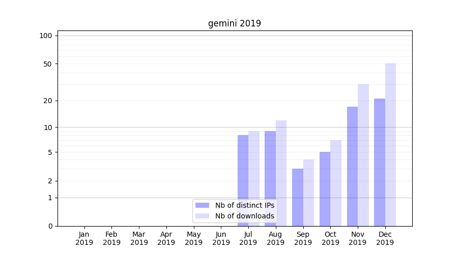 Number of downloads for software package gemini, year by year, from 2025 back to 2014 (years with no downloads are omitted):