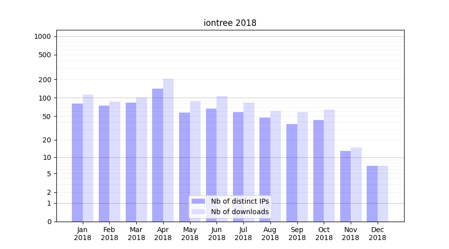 Number of downloads for software package iontree, year by year, from 2025 back to 2014 (years with no downloads are omitted):