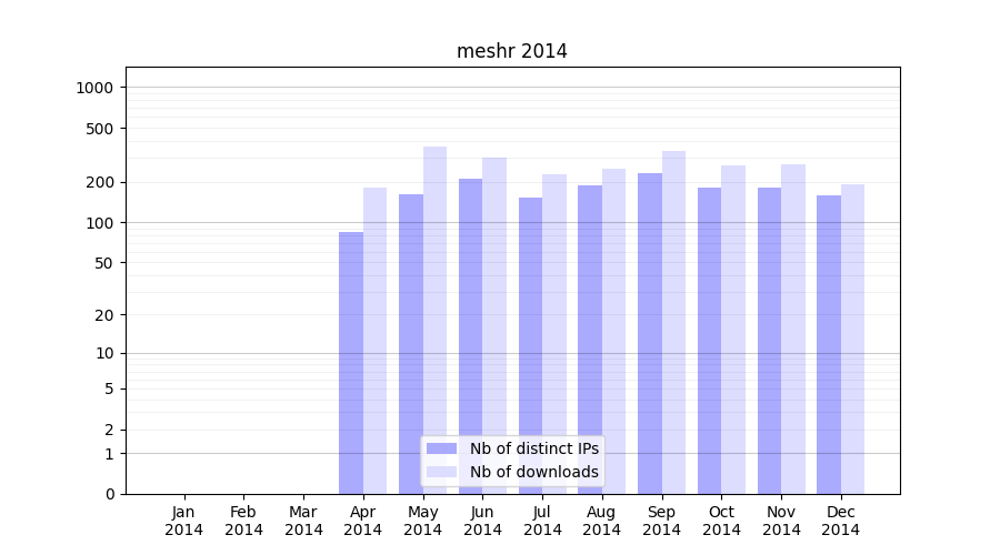 Number of downloads for software package meshr, year by year, from 2025 back to 2014 (years with no downloads are omitted):