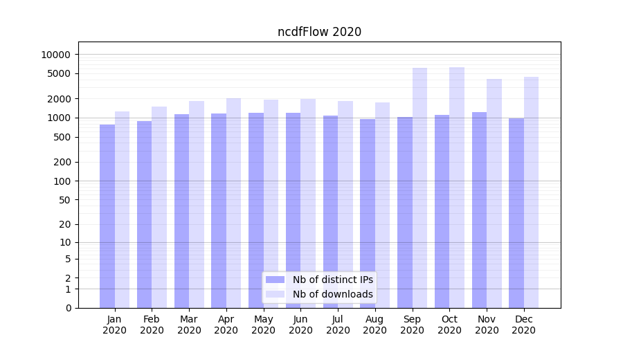 Number of downloads for software package ncdfFlow, year by year, from 2025 back to 2014 (years with no downloads are omitted):