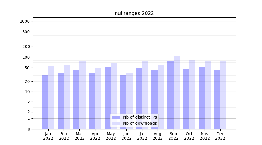 Number of downloads for software package nullranges, year by year, from 2025 back to 2014 (years with no downloads are omitted):
