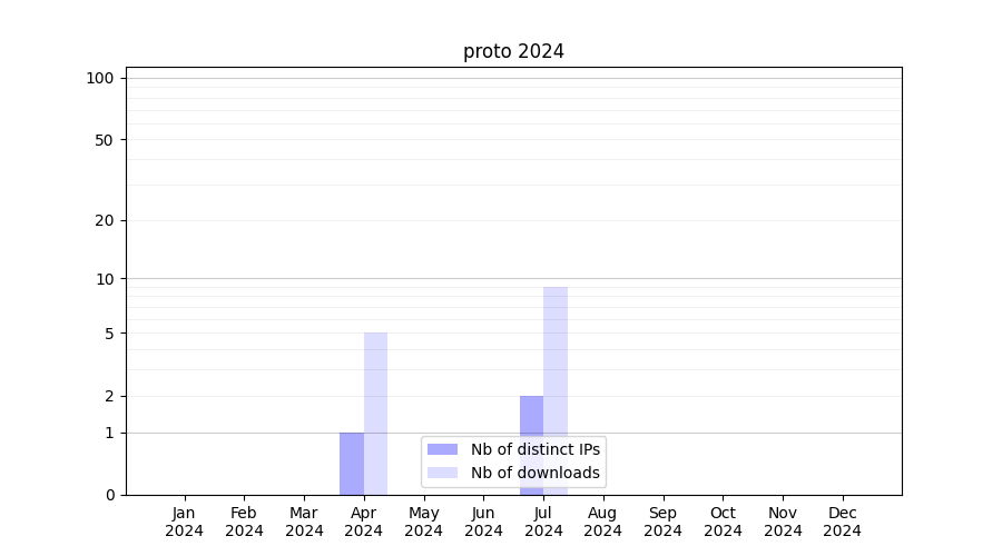 Number of downloads for software package proto, year by year, from 2025 back to 2014 (years with no downloads are omitted):