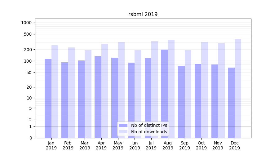 Number of downloads for software package rsbml, year by year, from 2025 back to 2014 (years with no downloads are omitted):