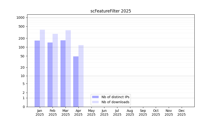 Number of downloads for software package scFeatureFilter, year by year, from 2025 back to 2014 (years with no downloads are omitted):