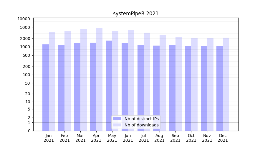 Number of downloads for software package systemPipeR, year by year, from 2025 back to 2014 (years with no downloads are omitted):
