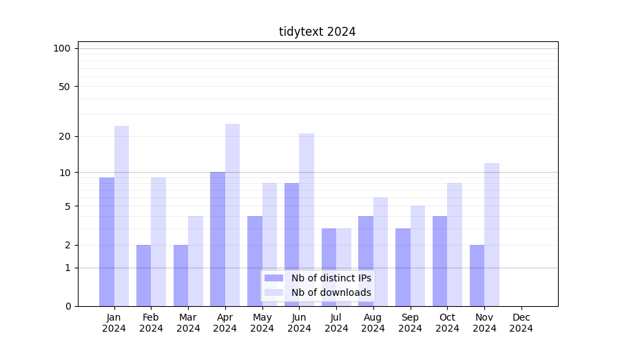 Number of downloads for software package tidytext, year by year, from 2025 back to 2014 (years with no downloads are omitted):