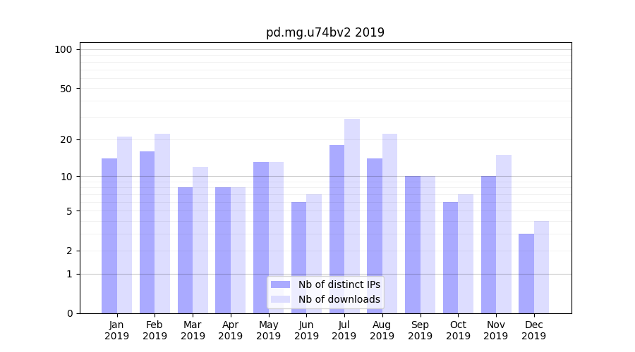 Number of downloads for annotation package pd.mg.u74bv2, year by year, from 2025 back to 2014 (years with no downloads are omitted):