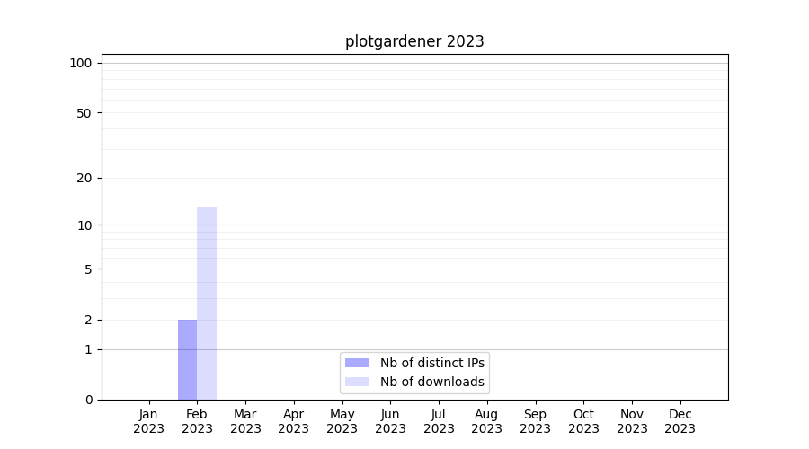 Number of downloads for annotation package plotgardener, year by year, from 2025 back to 2014 (years with no downloads are omitted):