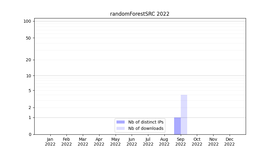 Number of downloads for annotation package randomForestSRC, year by year, from 2025 back to 2014 (years with no downloads are omitted):