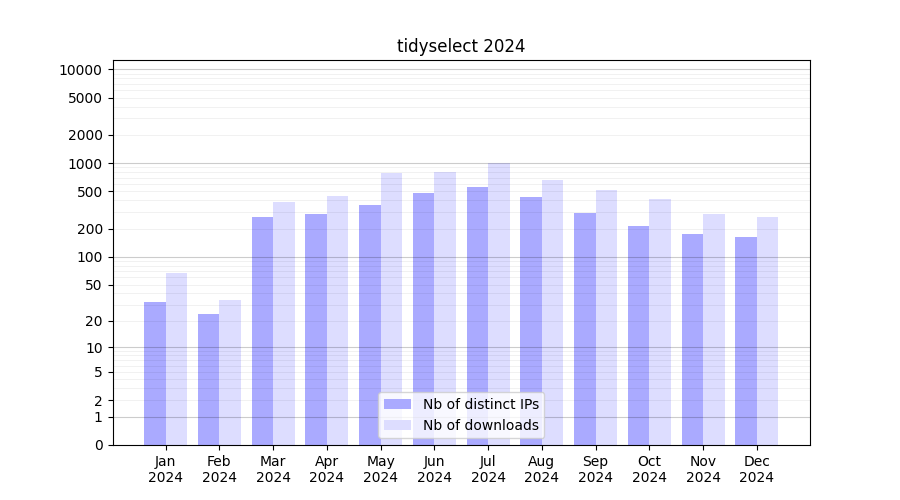 Number of downloads for annotation package tidyselect, year by year, from 2025 back to 2014 (years with no downloads are omitted):
