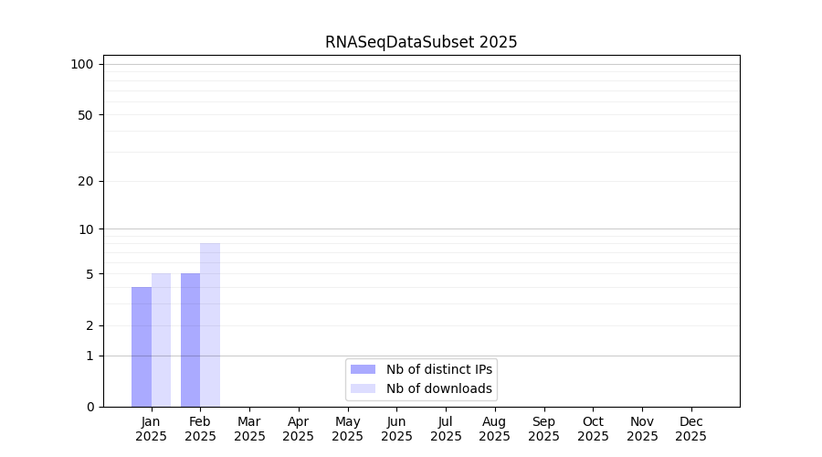 Number of downloads for experiment package RNASeqDataSubset, year by year, from 2025 back to 2014 (years with no downloads are omitted):