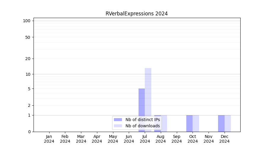 Number of downloads for experiment package RVerbalExpressions, year by year, from 2025 back to 2014 (years with no downloads are omitted):