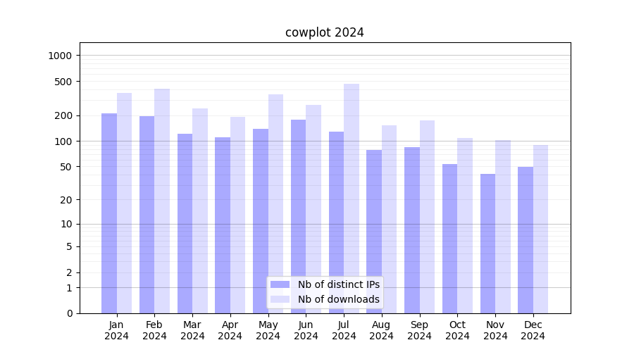 Number of downloads for experiment package cowplot, year by year, from 2025 back to 2014 (years with no downloads are omitted):