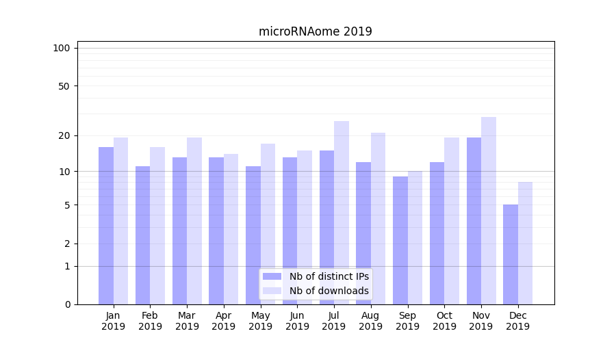 Number of downloads for experiment package microRNAome, year by year, from 2025 back to 2014 (years with no downloads are omitted):