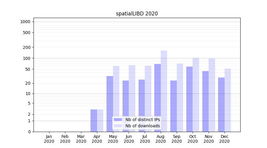 Number of downloads for experiment package spatialLIBD, year by year, from 2025 back to 2014 (years with no downloads are omitted):