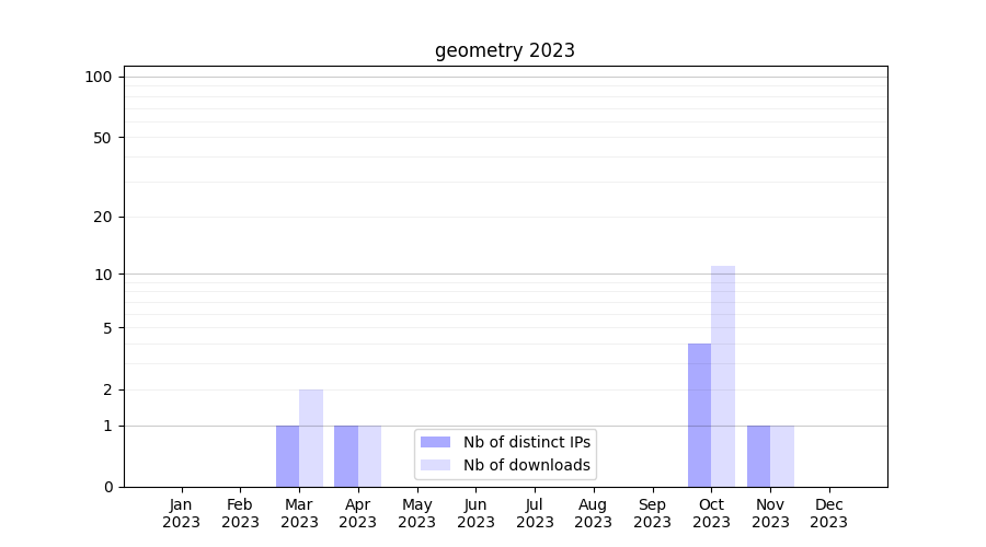 Number of downloads for workflow package geometry, year by year, from 2025 back to 2015 (years with no downloads are omitted):