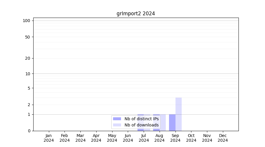 Number of downloads for workflow package grImport2, year by year, from 2025 back to 2015 (years with no downloads are omitted):