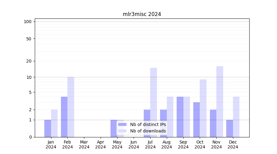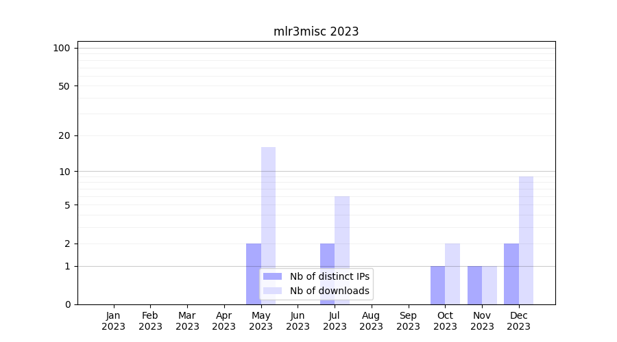 Number of downloads for workflow package mlr3misc, year by year, from 2025 back to 2015 (years with no downloads are omitted):