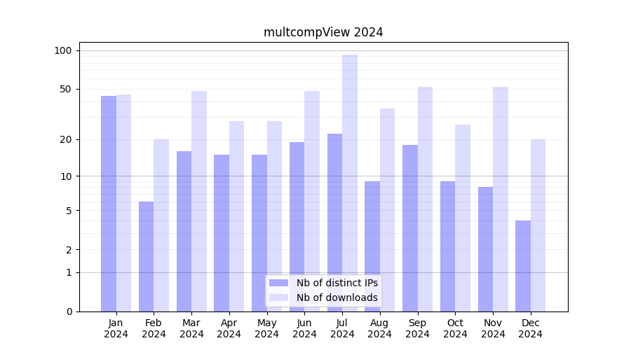 Number of downloads for workflow package multcompView, year by year, from 2025 back to 2015 (years with no downloads are omitted):