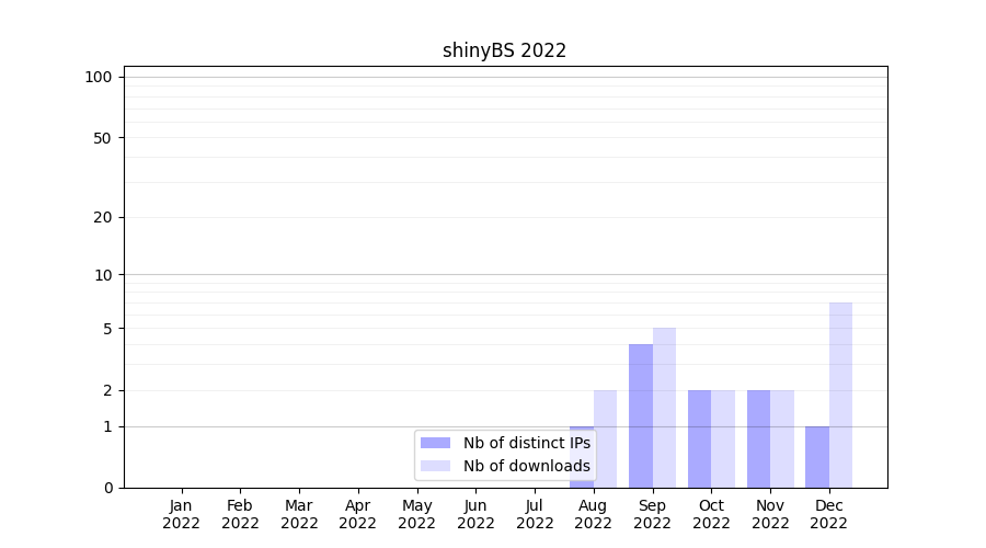 Number of downloads for workflow package shinyBS, year by year, from 2025 back to 2015 (years with no downloads are omitted):