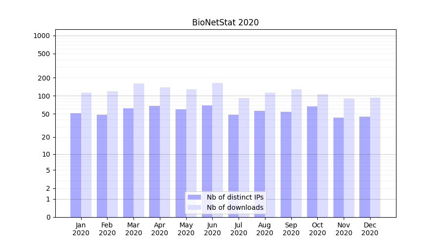Number of downloads for software package BioNetStat, year by year, from 2025 back to 2014 (years with no downloads are omitted):