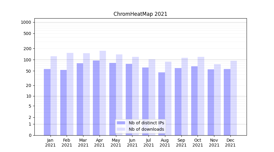 Number of downloads for software package ChromHeatMap, year by year, from 2025 back to 2014 (years with no downloads are omitted):