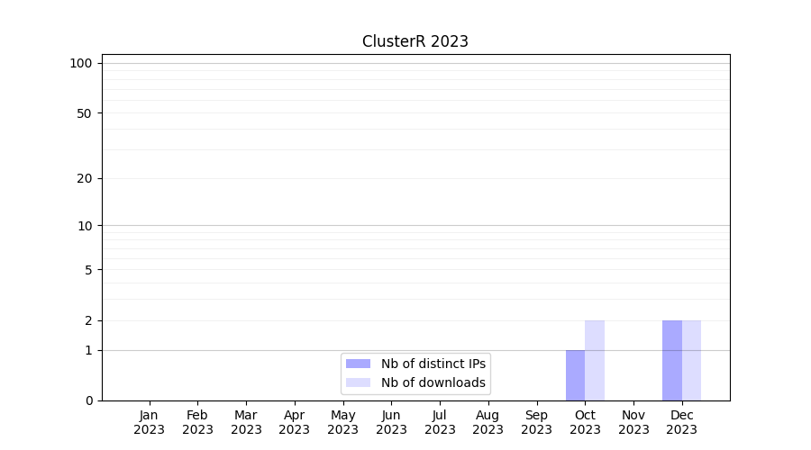 Number of downloads for software package ClusterR, year by year, from 2025 back to 2014 (years with no downloads are omitted):