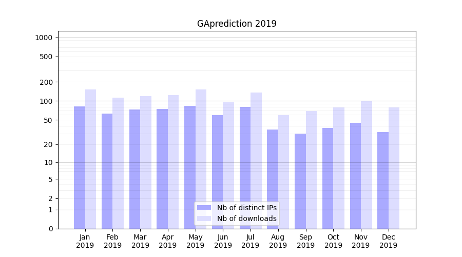 Number of downloads for software package GAprediction, year by year, from 2025 back to 2014 (years with no downloads are omitted):