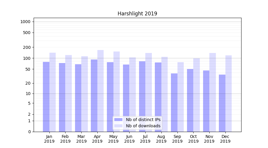 Number of downloads for software package Harshlight, year by year, from 2025 back to 2014 (years with no downloads are omitted):