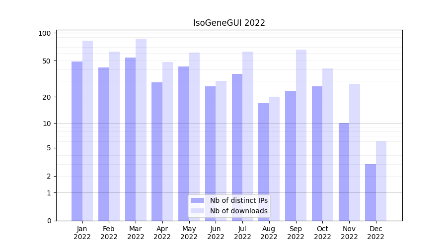 Number of downloads for software package IsoGeneGUI, year by year, from 2025 back to 2014 (years with no downloads are omitted):