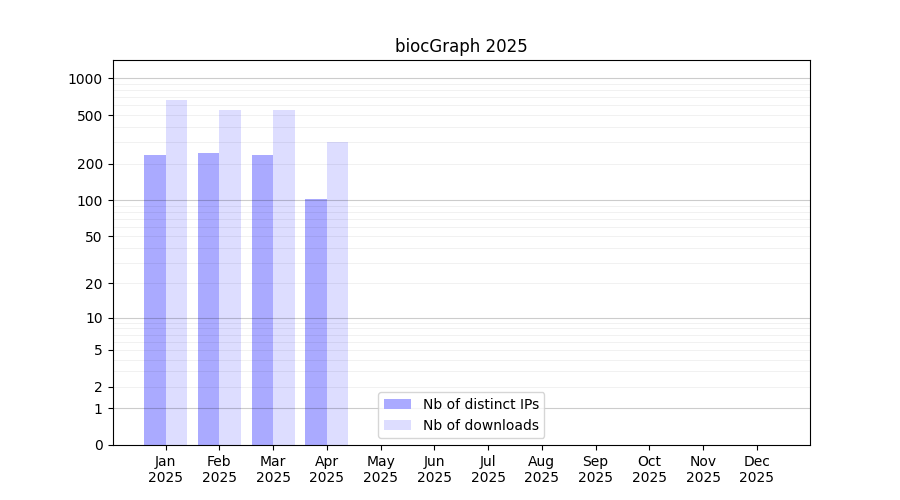 Number of downloads for software package biocGraph, year by year, from 2025 back to 2014 (years with no downloads are omitted):