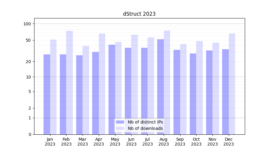 Number of downloads for software package dStruct, year by year, from 2025 back to 2014 (years with no downloads are omitted):