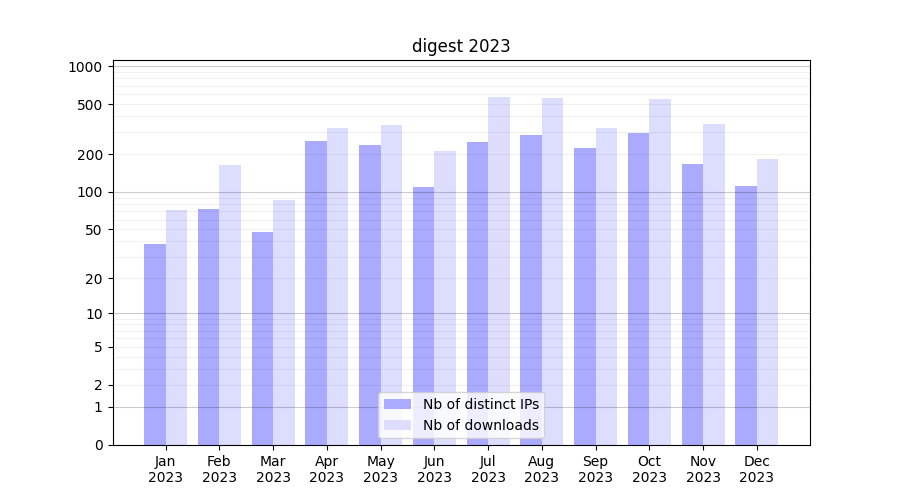 Number of downloads for software package digest, year by year, from 2025 back to 2014 (years with no downloads are omitted):